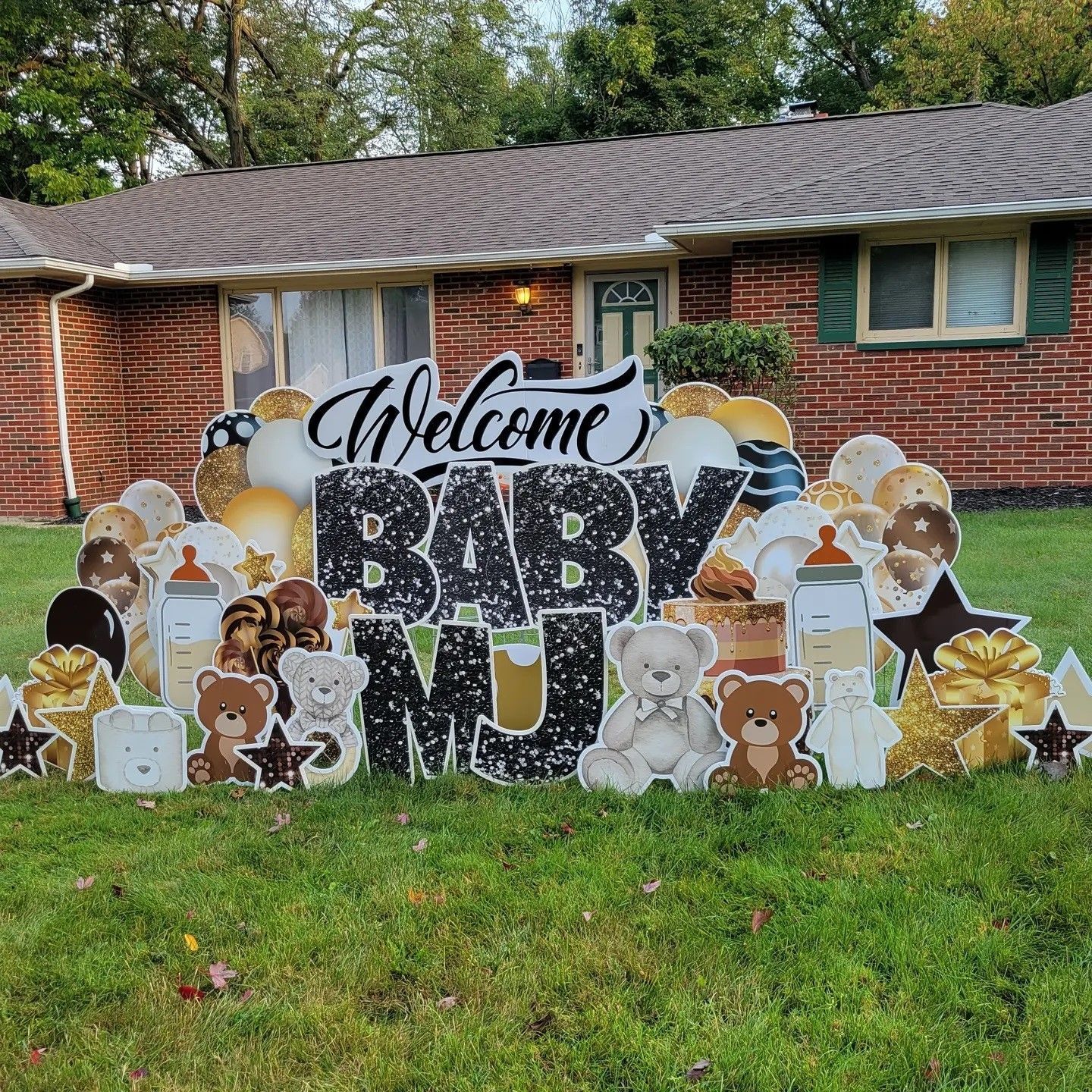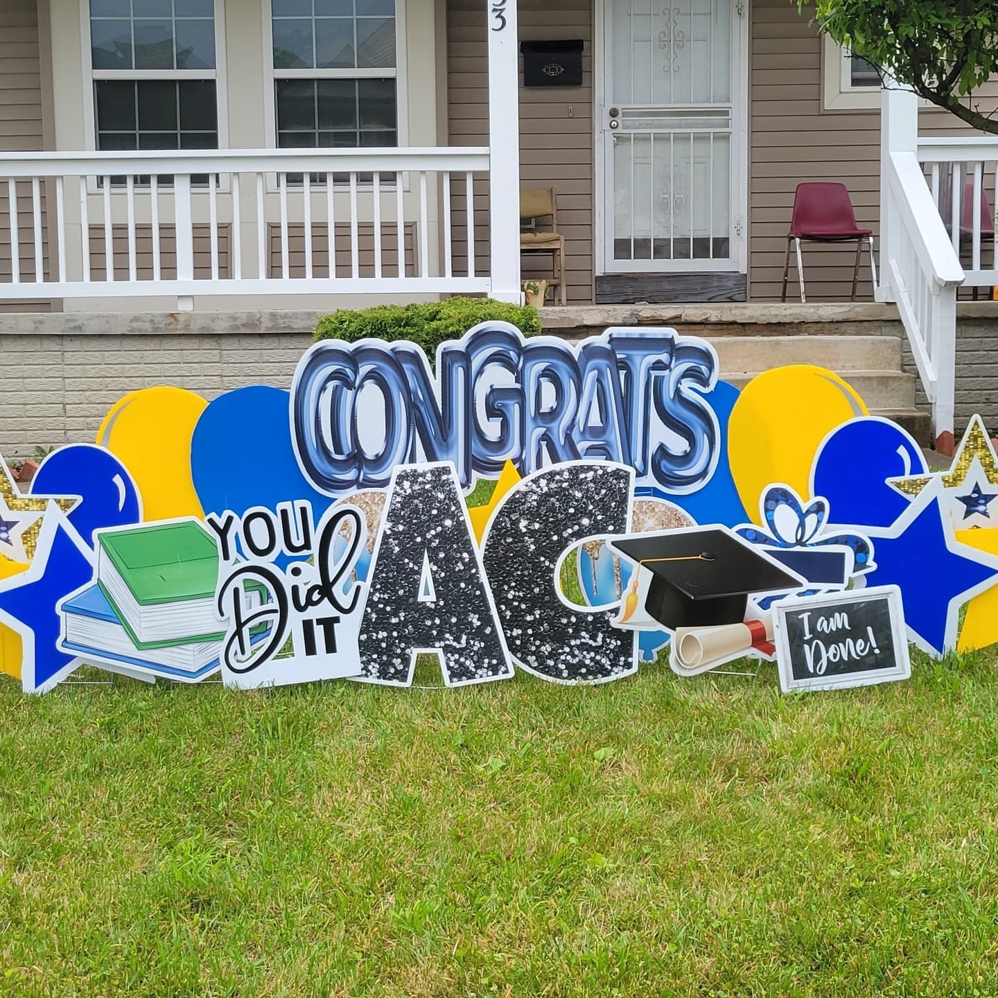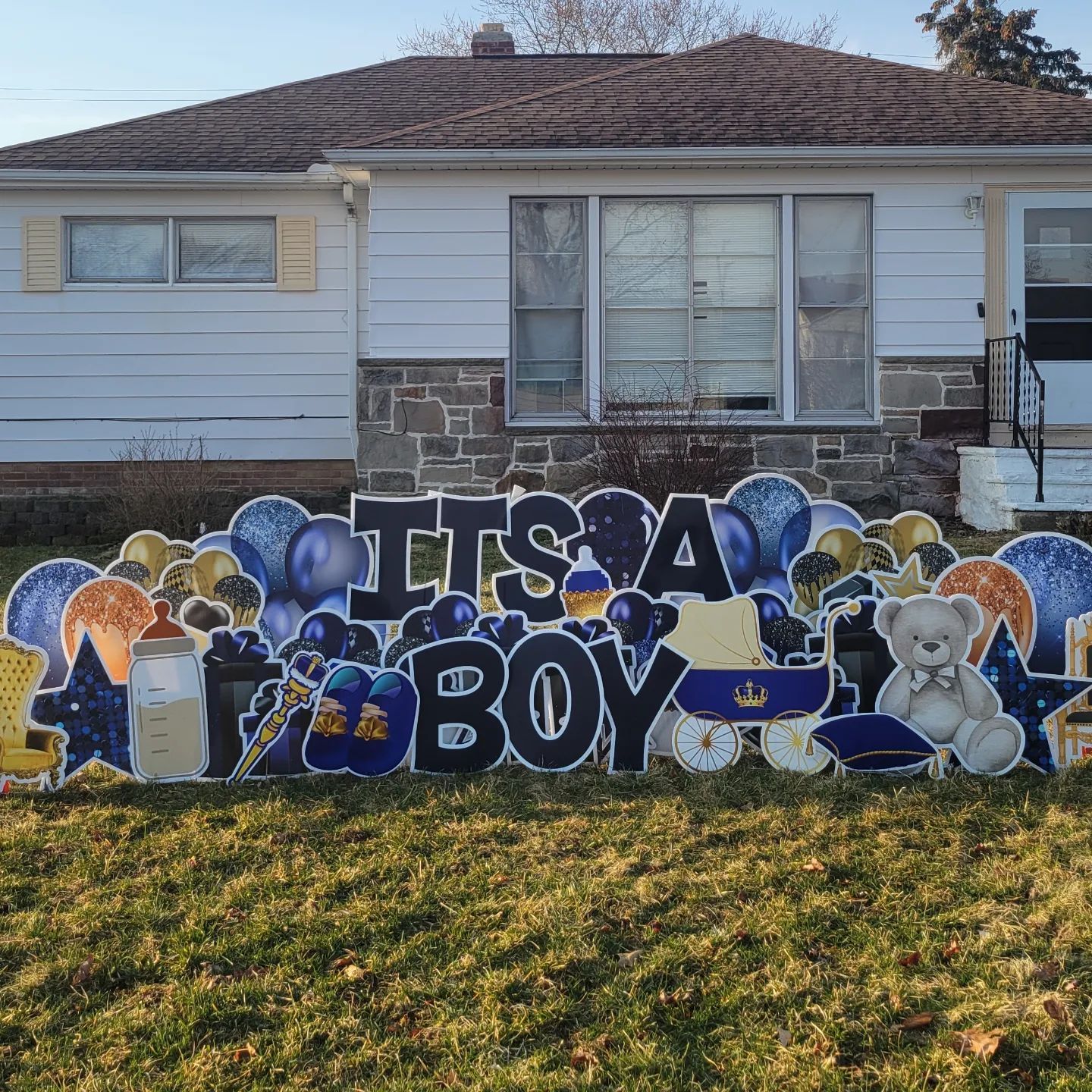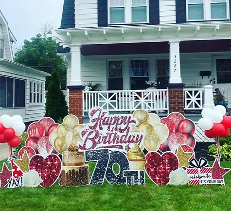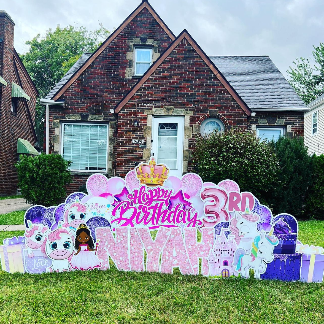 Yard cards start from $110 (with no name). $125 with 1 name and age (optional) up to 7 letters. Additional letters are $7 each, two names max please. All cards come with selected graphics, stars and balloons. Themed cards start from $130 and include 1 name and age (optional) up to 7 letters. Additional characters are $7 each. Some themes include Mermaid, Princess, Unicorns, Dinosaurs, gaming, retirements and more. For a full list, refer to themed cards section. Custom cards start from $135 up to 20 characters. Rush/delivery fees may apply, and same day delivery is not guaranteed. We understand that you may need to place an order on short notice, so we are happy to offer a rush fee for last minute orders. A $25 rush fee will be added to last minute orders placed within 24 hours of your event. The day before an event and the day of an event is considered last minute. Delivery fee is based on city and miles traveled. Serving the greater Cleveland area.